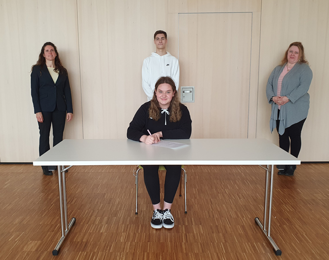Die Vertreter der drei in der Schule wichtigen Kooperationspartner, also Schüler und Schülerinnen, Eltern und Lehrkräfte unterzeichneten am 21.05.2021 gemeinsam den digitalen Verhaltenskodex der Verbundschule. Das Originaldokument wird im Schulgebäude einen Ehrenplatz erhalten.