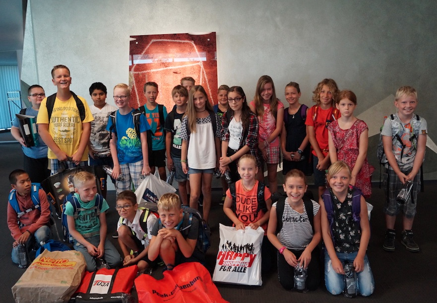 Im Foyer des Kurhauses überraschten Frau Ries- Müller und Frau Klösters vom Förderverein der Verbundschule die Kinder noch mit einem kleinen Willkommensgeschenk. Eine Wasserflasche der Verbundschule, die sie am Wasserspender in der Mensa jederzeit mit erfrischendem Sprudel oder stillem Wasser auffüllen können begleitet die Kinder fortan.